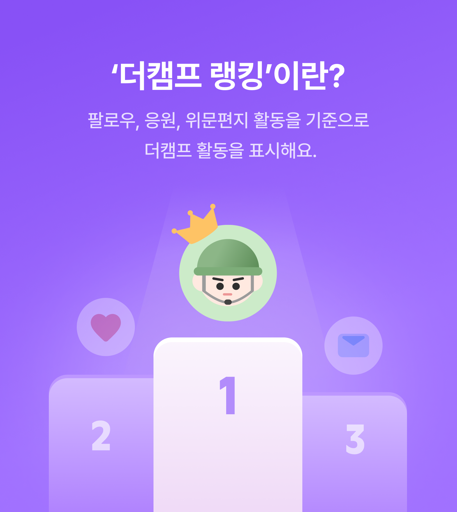 군인 사용자의 팔로우, 응원, 위문편지 활동을 기준으로 더캠프 랭킹을 표시합니다.